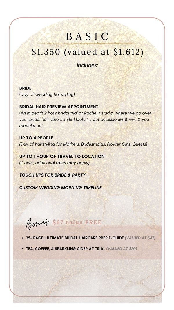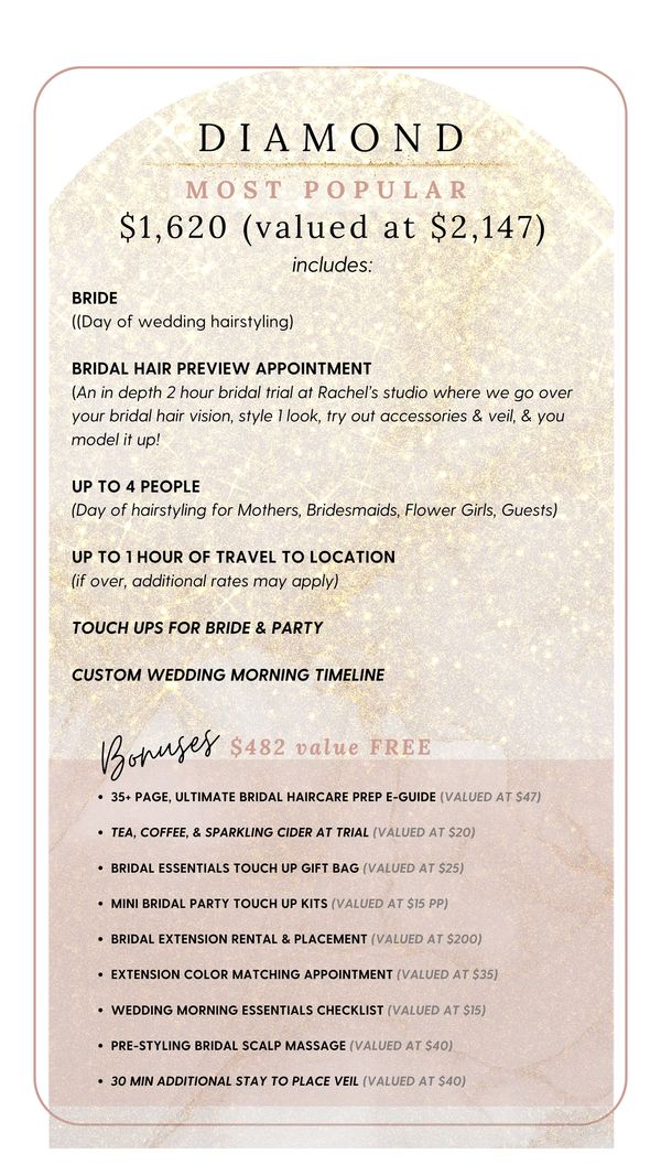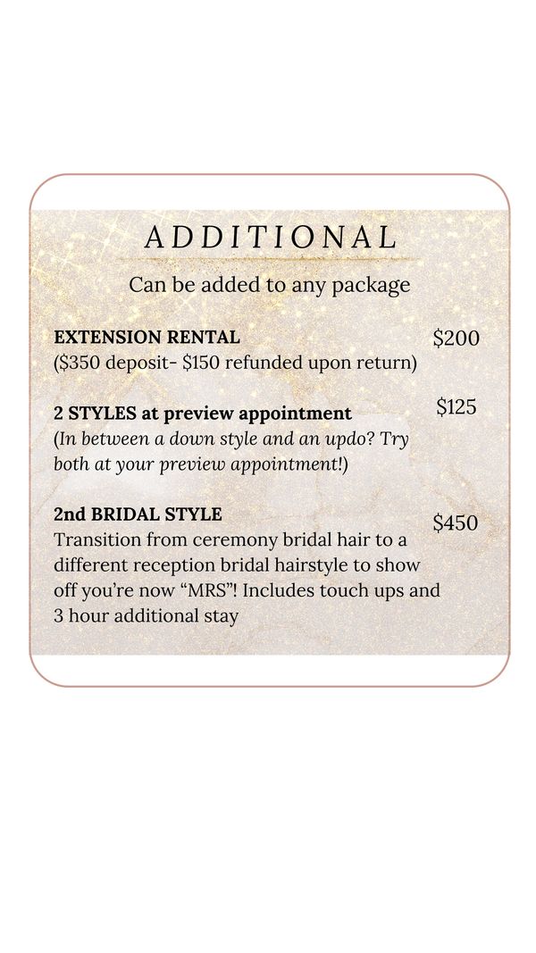 Since I offer packages and every party has a different budget, it’s important to me that you have full control over how much you would like to ask of your party to pay for their hair. An appropriate range that is expected for the bridal party is approximately $125 - $175+ per person.